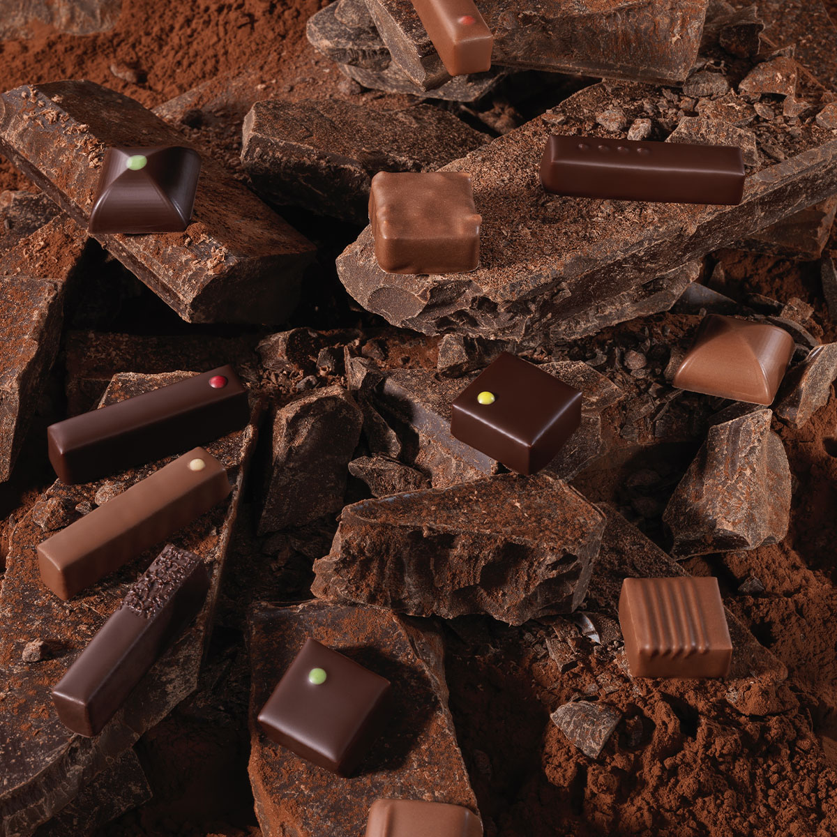 Assortiments de ganaches et pralinés, en chocolat noir ou lait