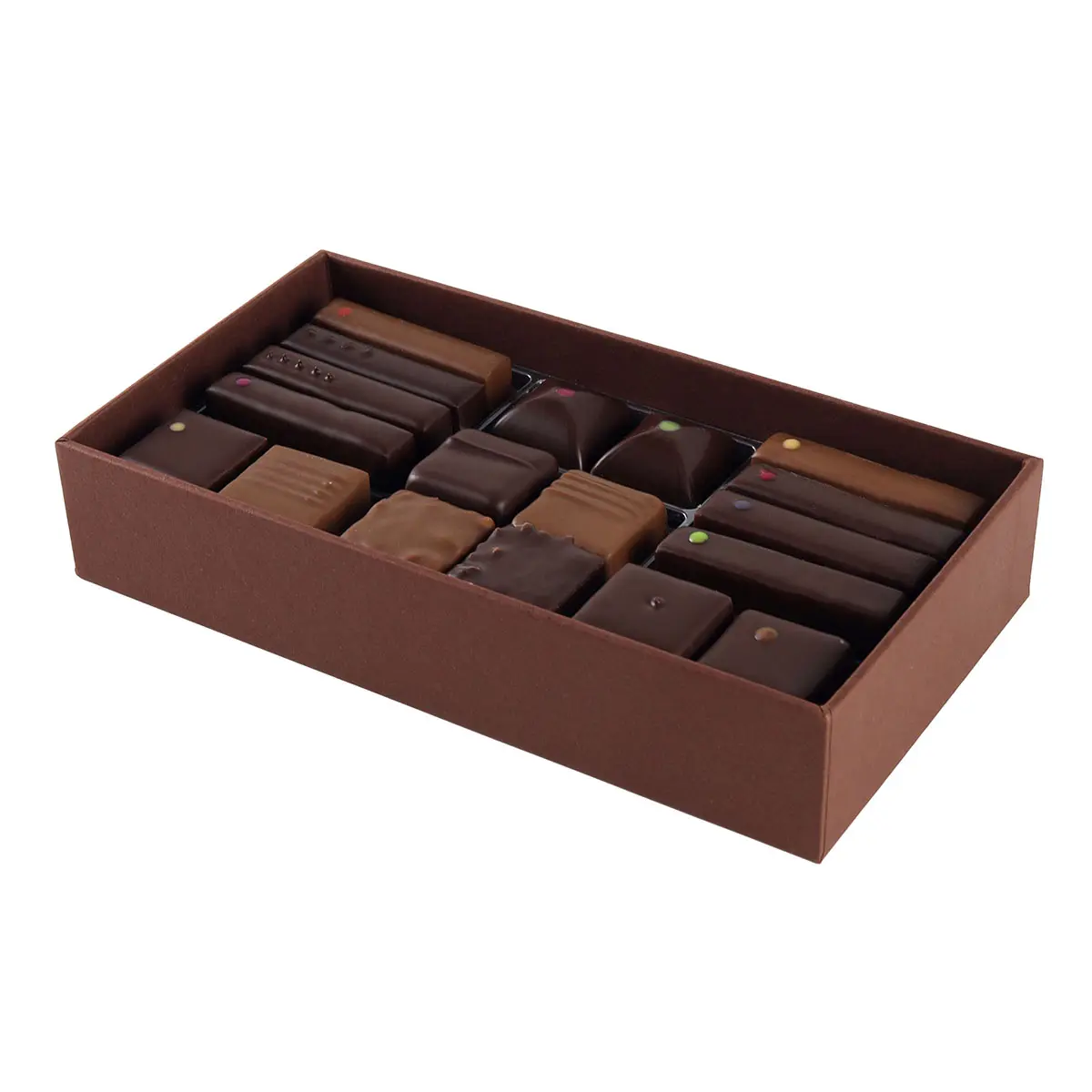 Ingrédients : Chocolat noir, Chocolat au LAIT, Beurre de cacao, Pâte de cacao, Chocolat blanc, Spécialité à base de beurre de cacao et Poudre de cacao : 48,54% (27,47% Teneur en cacao minimum) (fèves de cacao, sucre, beurre de cacao, émulsifiant : lécithine de SOJA, LAIT entier en poudre, extrait naturel de vanille, émulsifiant : lécithine de tournesol, fèves de cacao du Perou issue de l'agriculture biologique certifié par FR-BIO-01, sucre de canne, LAIT écrémé, lactoserum, beurre, fèves de cacao de Madagascar, sucre roux, extrait de malt d'ORGE, jus de fruits de la passion déshydraté, fraise en poudre, sirop glucose déshydraté), Sucre et Sirop de glucose (sucre, eau, amidon), CRÈME liquide stérilisée UHT (CREME, épaississant : carraghénanes), AMANDES et Pâte d'AMANDE (amande, sucre, eau, pistache, sirop de sucre inverti), NOISETTES, BEURRE (CREME pasteurisé, ferment lactique), Purée de fruit et PISTACHE (fruit de la passion, sucre, cassis, citron vert, framboise, fraise, gingembre), Stabilisant : sorbitol, Chocolat blanc : 1,32% (0,44% Beurre de cacao minimum) (beurre de cacao, LAIT entier en poudre, sucre, extrait naturel de vanille, émulsifiant : lécithine de tournesol, émulsifiant : lécithine de SOJA), PISTACHE et Pâte de PISTACHE (pistaches), LAIT entier UHT, Biscuit (farine de BLE, sucre, matière grasse laitière anhydre, sucre du LAIT, protéines de LAIT, sel, extrait de malt, poudre à lever), Gianduja (NOISETTES, sucre, LAIT entier en poudre, beurre de cacao, fèves de cacao, extrait naturel de vanille), NOISETTES caramélisées (sucre, NOISETTES), Eau, Riz soufflé (farine de riz), Poudre de LAIT 0% MG, Farine de BLÉ Bio, Café, Édulcorant : Dextrose, Alcool (eau, framboise, cognac, mandarine, sirop de sucre, alcool, extraits naturels de menthe, cerise), Sirop de glucose, Extrait naturel de vanille et Gousse de vanille (sirop de sucre de canne, extrait de vanille bourbon, grains de vanille épuisée), Thé (thé ceylan), SARRAZIN, OEUF entier, Poudre de yuzu (dextrine, jus de yuzu), Menthe, Fleur de sel, Concentré de (Fraise), Zeste de citron, Sucre vanillé, Basilic, Pectine, Epices (tonka, poivre noir, poivre blanc, poivre gris, piment du mexique, baies roses), Denrée alimentaire colorante (carthame, citron, radis, cassis, pomme, concentré de curcuma, spiruline, carotte, hibiscus), Arôme naturel (extrait naturel de fraise, sucre invertit, glycerine), Huile d'olive, Émulsifiant : Lécithine de tournesol, Agent d'enrobage: (gomme laque, gomme arabique), Sel.