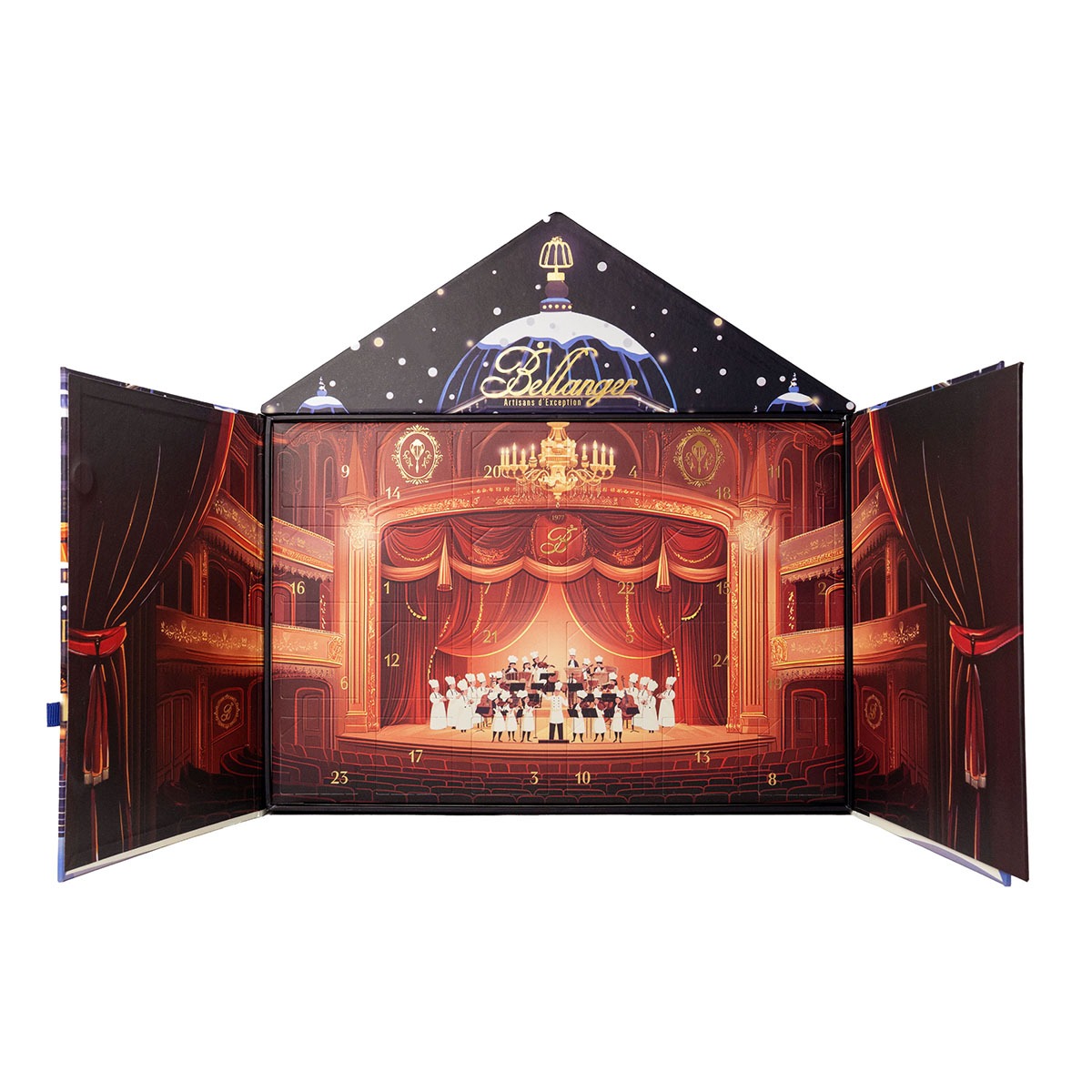 Ingrédients : Chocolat noir, Chocolat au LAIT, Beurre de cacao, Chocolat blanc, Poudre de cacao et Spécialité à base de beurre de cacao : 33,26% (17,14% Teneur en cacao minimum) (fèves de cacao, sucre, beurre de cacao, émulsifiant : lécithine de SOJA, LAIT entier en poudre, extrait naturel de vanille, émulsifiant : lécithine de tournesol, LAIT écrémé, lactoserum, beurre, fèves de cacao du Perou issue de l'agriculture biologique certifié par FR-BIO-01, sucre de canne, jus de fruits de la passion déshydraté, sucre roux, extrait de malt d'ORGE, fraise en poudre, sirop glucose déshydraté), Sucre et Sirop de glucose (sucre, amidon), AMANDES et Pâte d'AMANDE : 10,76% (amande, sucre, eau, pistache, sirop de sucre inverti), NOISETTES : 10,42%, CRÈME liquide stérilisée UHT (CREME, épaississant : carraghénanes), Cerises confites, Purée de fruit et PISTACHE (cerises dénoyautées, sirop de glucose et fructose, sucre, fruit de la passion, citron vert), BEURRE (CREME pasteurisé, ferment lactique), PISTACHE et Pâte de PISTACHE : 2,00% (pistaches), Eau, Biscuit (farine de BLE, sucre, matière grasse laitière anhydre, sucre du LAIT, protéines de LAIT, sel, extrait de malt, poudre à lever), Gianduja (NOISETTES, sucre, LAIT entier en poudre, beurre de cacao, fèves de cacao, extrait naturel de vanille), NOISETTES caramélisées (sucre, NOISETTES), Riz soufflé (farine de riz), Sucre vanillé, Chocolat blanc (sucre, beurre de cacao, LAIT entier en poudre, extrait naturel de vanille, émulsifiant : lécithine de SOJA, émulsifiant : lécithine de tournesol), Farine de BLÉ Bio, Poudre de LAIT 0% MG, Fleur de sel, SARRAZIN, OEUF entier, Extrait naturel de vanille et Gousse de vanille (sirop de sucre de canne, extrait de vanille bourbon, grains de vanille épuisée), Poudre de yuzu (dextrine, jus de yuzu), Édulcorant : Dextrose, Alcool (eau, cerise), Sirop de glucose, Denrée alimentaire colorante (radis, cassis, pomme, carthame, citron, concentré de curcuma, spiruline), Sel, Agent d'enrobage: (gomme laque, gomme arabique), Huile d'olive.