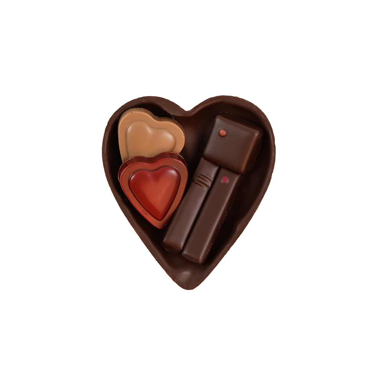 Ingrédients : Chocolat noir, Chocolat au LAIT, Beurre de cacao et Pâte de cacao : 73,00% (44,46% Teneur en cacao minimum) (fèves de cacao, sucre, beurre de cacao, émulsifiant : lécithine de SOJA, extrait naturel de vanille, LAIT entier en poudre, émulsifiant : lécithine de tournesol), Sucre et Sirop de glucose (sucre, eau), CRÈME liquide stérilisée UHT (CREME, épaississant : carraghénanes), AMANDES, Purée de fruit (framboise, sucre, fruit de la passion), CRÈME liquide stérilisée UHT (CREME, épaississant : carraghénanes), BEURRE (CREME pasteurisé, ferment lactique), Chocolat blanc : 1,46% (0,48% Beurre de cacao minimum) (sucre, beurre de cacao, LAIT entier en poudre, extrait naturel de vanille, émulsifiant : lécithine de SOJA), Colorant et Denrée alimentaire colorante (E555, E172, radis, cassis, pomme, carthame, citron), Stabilisant : sorbitol, LAIT entier UHT, Eau, Édulcorant : Dextrose, Poudre de yuzu (dextrine, jus de yuzu), Alcool (eau, framboise), Fleur de sel, Pectine, Huile d'olive, Gousse de vanille, Émulsifiant : Lécithine de tournesol.