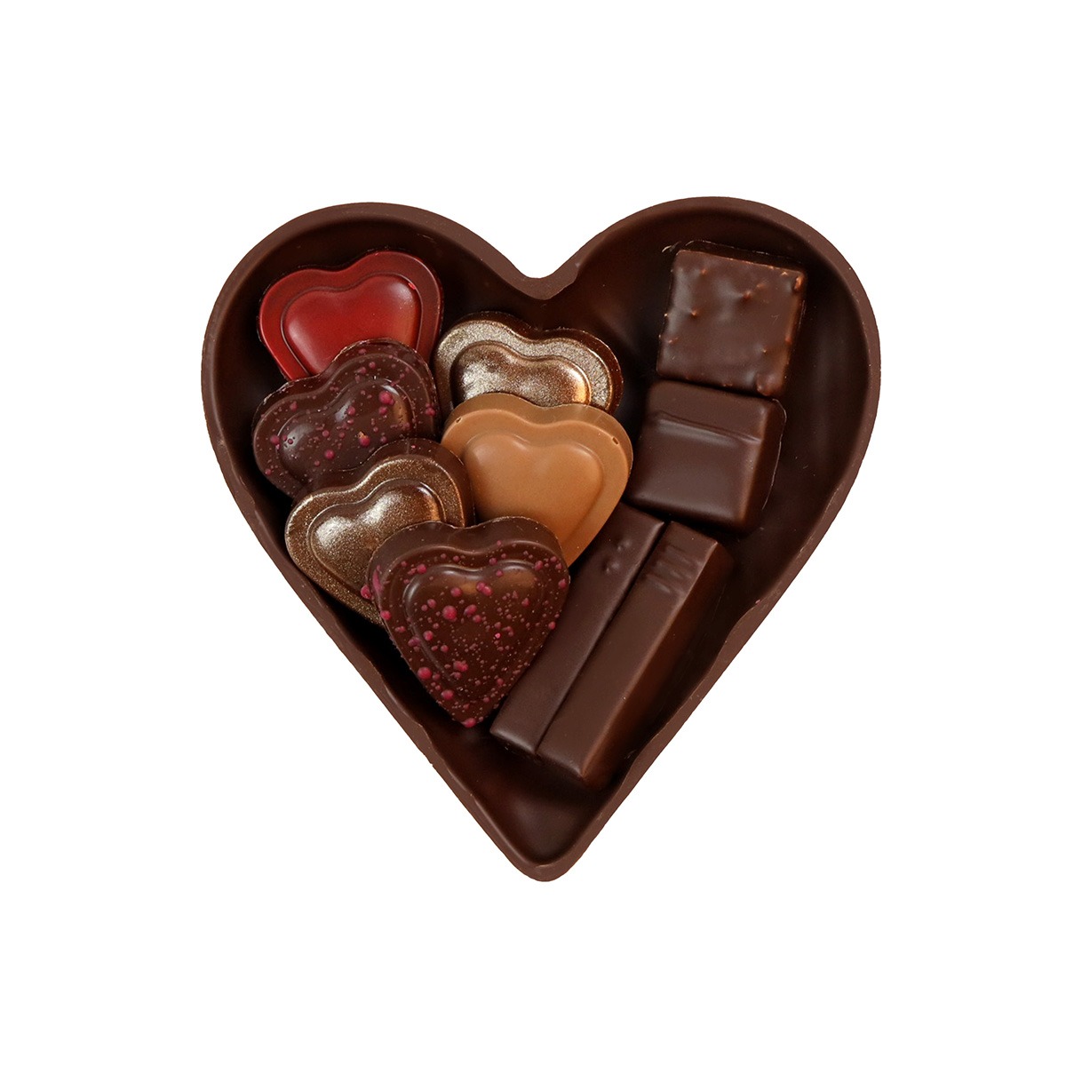 Ingrédients : Chocolat noir, Chocolat au LAIT, Beurre de cacao et Pâte de cacao : 72,45% (43,38% Teneur en cacao minimum) (fèves de cacao, sucre, beurre de cacao, émulsifiant : lécithine de SOJA, LAIT entier en poudre, extrait naturel de vanille, émulsifiant : lécithine de tournesol, poudre de cacao maigre, arôme naturel de vanille), Sucre et Sirop de glucose, NOISETTES, CRÈME liquide stérilisée UHT (CREME, épaississant : carraghénanes), Chocolat blanc : 1,85% (0,61% Beurre de cacao minimum) (beurre de cacao, LAIT entier en poudre, sucre, extrait naturel de vanille, émulsifiant : lécithine de tournesol, émulsifiant : lécithine de SOJA), Purée de fruit (framboise, sucre, fruit de la passion), AMANDES, CRÈME liquide stérilisée UHT (CREME, épaississant : carraghénanes), BEURRE (CREME pasteurisé, ferment lactique), Riz soufflé (farine de riz), Colorant et Denrée alimentaire colorante (E555, E172, radis, cassis, pomme), Stabilisant : sorbitol, Poudre de LAIT 0% MG, Eau, Sirop de glucose, Gianduja (NOISETTES, sucre, LAIT entier en poudre, beurre de cacao, fèves de cacao, extrait naturel de vanille), Alcool (eau, framboise, cognac, mandarine), Thé (thé ceylan), Huile d'olive, Pectine, Extrait naturel de vanille et Gousse de vanille (sirop de sucre de canne, extrait de vanille bourbon, grains de vanille épuisée), Fleur de sel, Émulsifiant : Lécithine de tournesol.