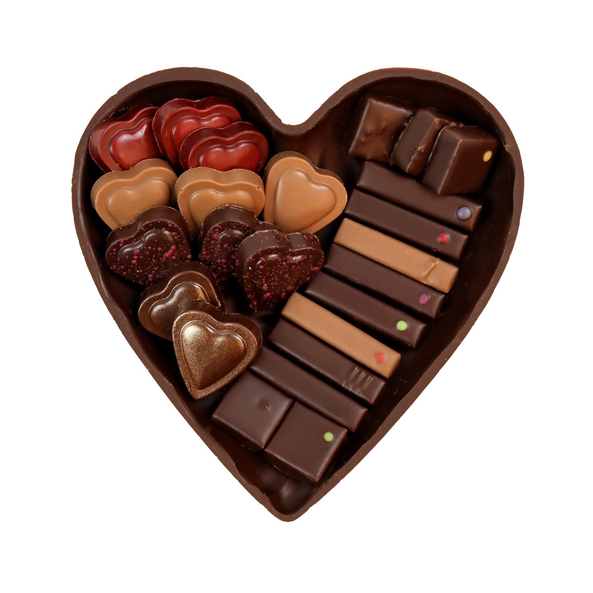 Ingrédients : Chocolat noir, Chocolat au LAIT, Beurre de cacao, Pâte de cacao et Chocolat blanc : 67,20% (39,50% Teneur en cacao minimum) (fèves de cacao, sucre, beurre de cacao, émulsifiant : lécithine de SOJA, LAIT entier en poudre, extrait naturel de vanille, émulsifiant : lécithine de tournesol, LAIT écrémé, lactoserum, beurre, sucre roux, extrait de malt d'ORGE), Sucre et Sirop de glucose (sucre, eau, amidon), Chocolat blanc : 6,31% (2,08% Beurre de cacao minimum) (beurre de cacao, LAIT entier en poudre, sucre, extrait naturel de vanille, émulsifiant : lécithine de tournesol, émulsifiant : lécithine de SOJA), AMANDES et Pâte d'AMANDE (amande, sucre, eau, pistache, sirop de sucre inverti), Purée de fruit (framboise, sucre, fruit de la passion, cassis, fraise), CRÈME liquide stérilisée UHT (CREME, épaississant : carraghénanes), NOISETTES, BEURRE (CREME pasteurisé, ferment lactique), PISTACHE et Pâte de PISTACHE (pistaches), Stabilisant : sorbitol, Sirop de glucose, Riz soufflé (farine de riz), Eau, CRÈME liquide stérilisée UHT (CREME, épaississant : carraghénanes), Colorant et Denrée alimentaire colorante (E555, E172, radis, cassis, pomme, carthame, citron, spiruline, carotte, hibiscus), Poudre de LAIT 0% MG, Alcool (eau, framboise, sirop de sucre, alcool, extraits naturels de menthe, cerise), Huile d'olive, Farine de BLÉ Bio, LAIT entier UHT, Pectine, Édulcorant : Dextrose, Café, SARRAZIN, OEUF entier, Poudre de yuzu (dextrine, jus de yuzu), Menthe, Concentré de (Fraise), Basilic, Extrait naturel de vanille et Gousse de vanille (sirop de sucre de canne, extrait de vanille bourbon, grains de vanille épuisée), Fleur de sel, Arôme naturel (extrait naturel de fraise, sucre invertit, glycerine), Émulsifiant : Lécithine de tournesol.