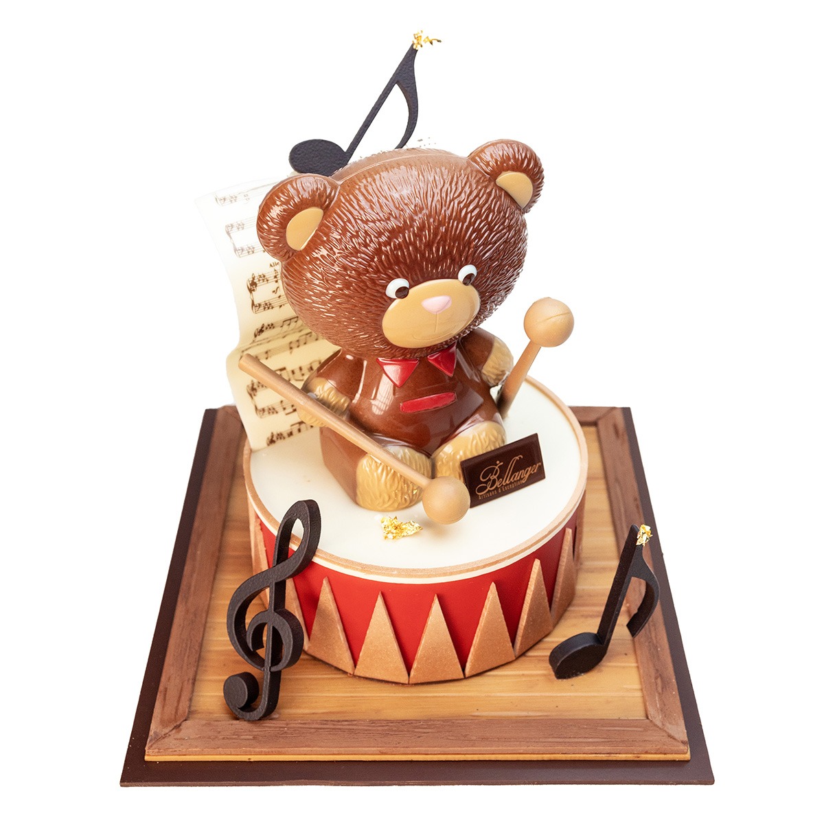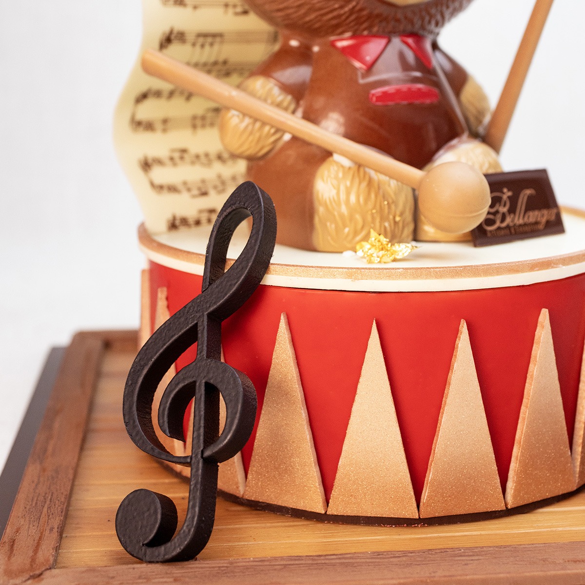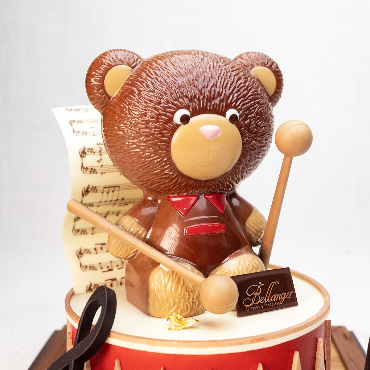 Oui, chaque élément — du tambour au petit ourson — est réalisé entièrement en chocolat artisanal.